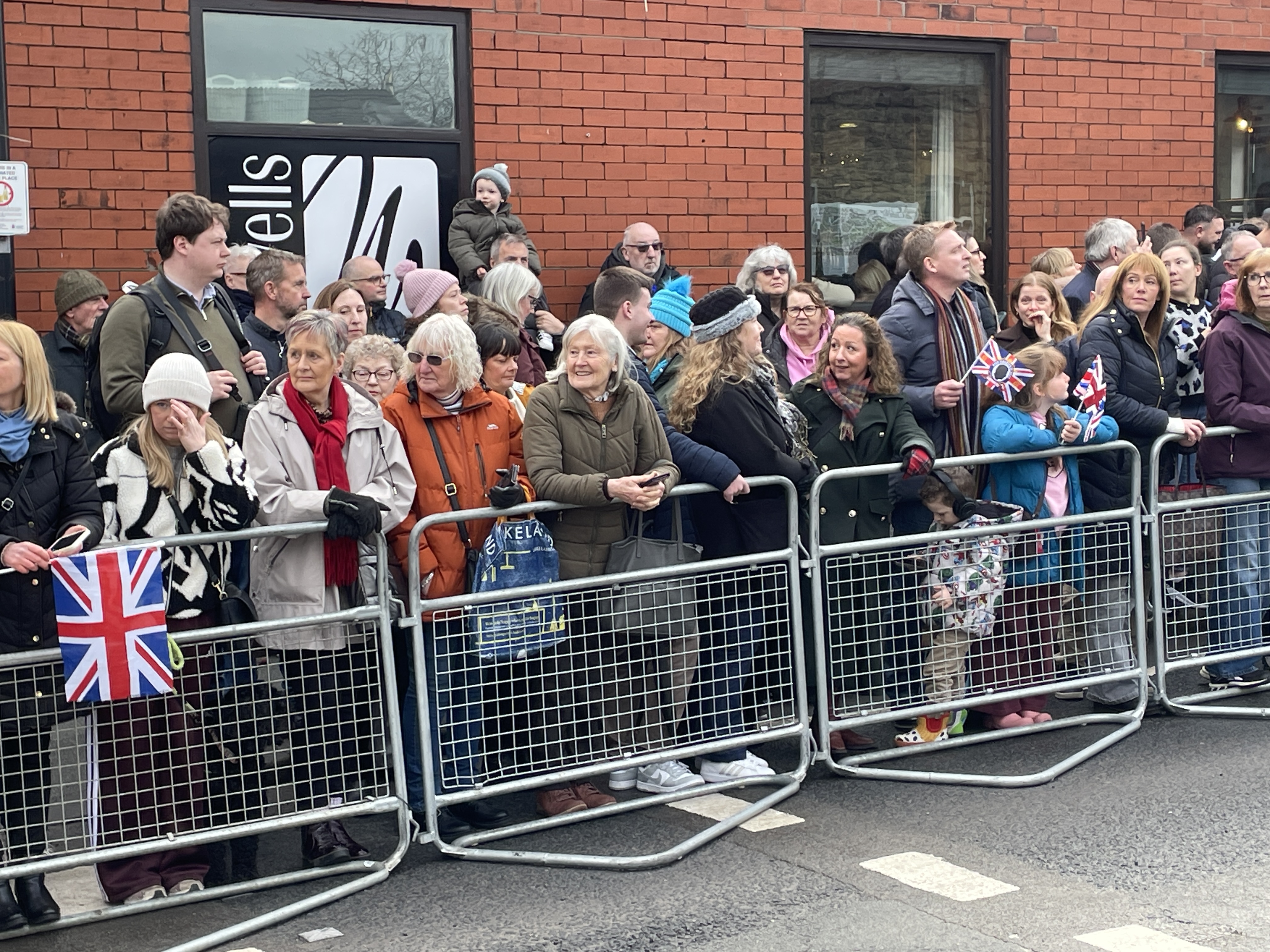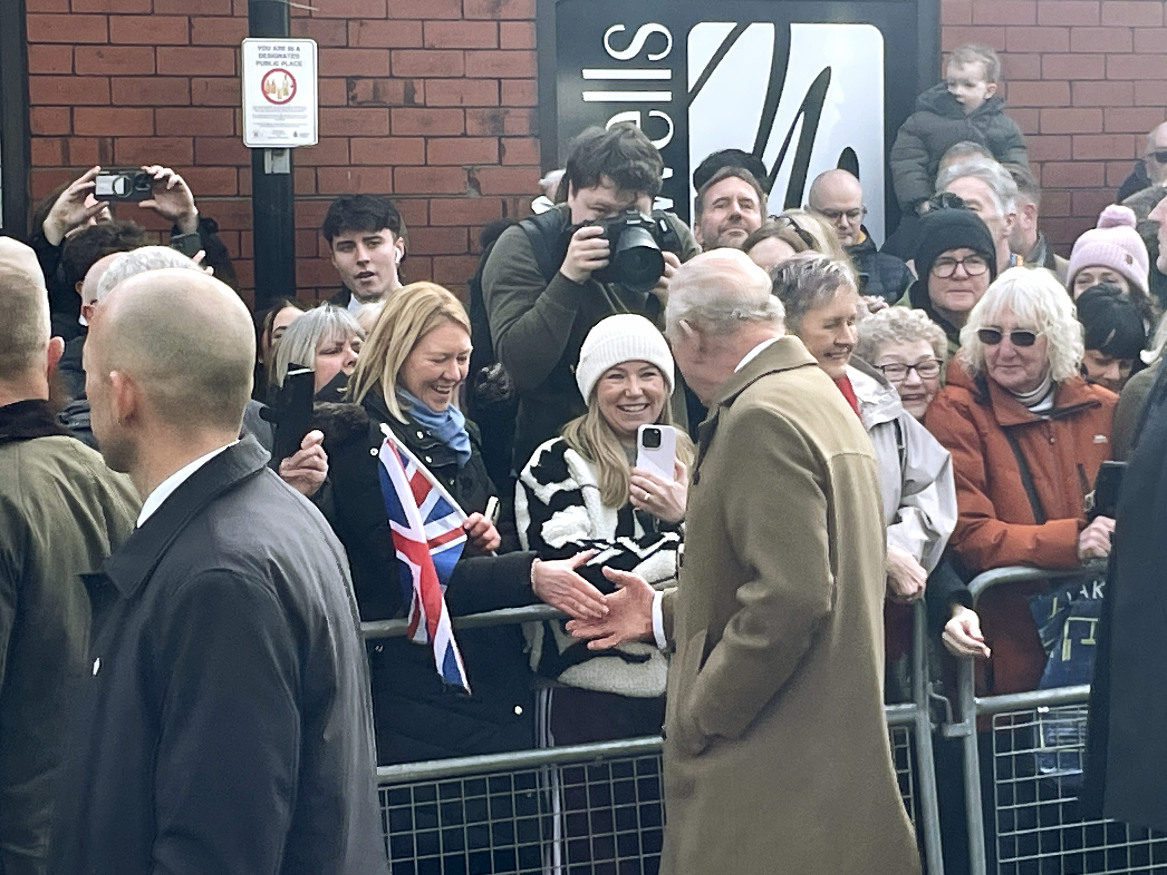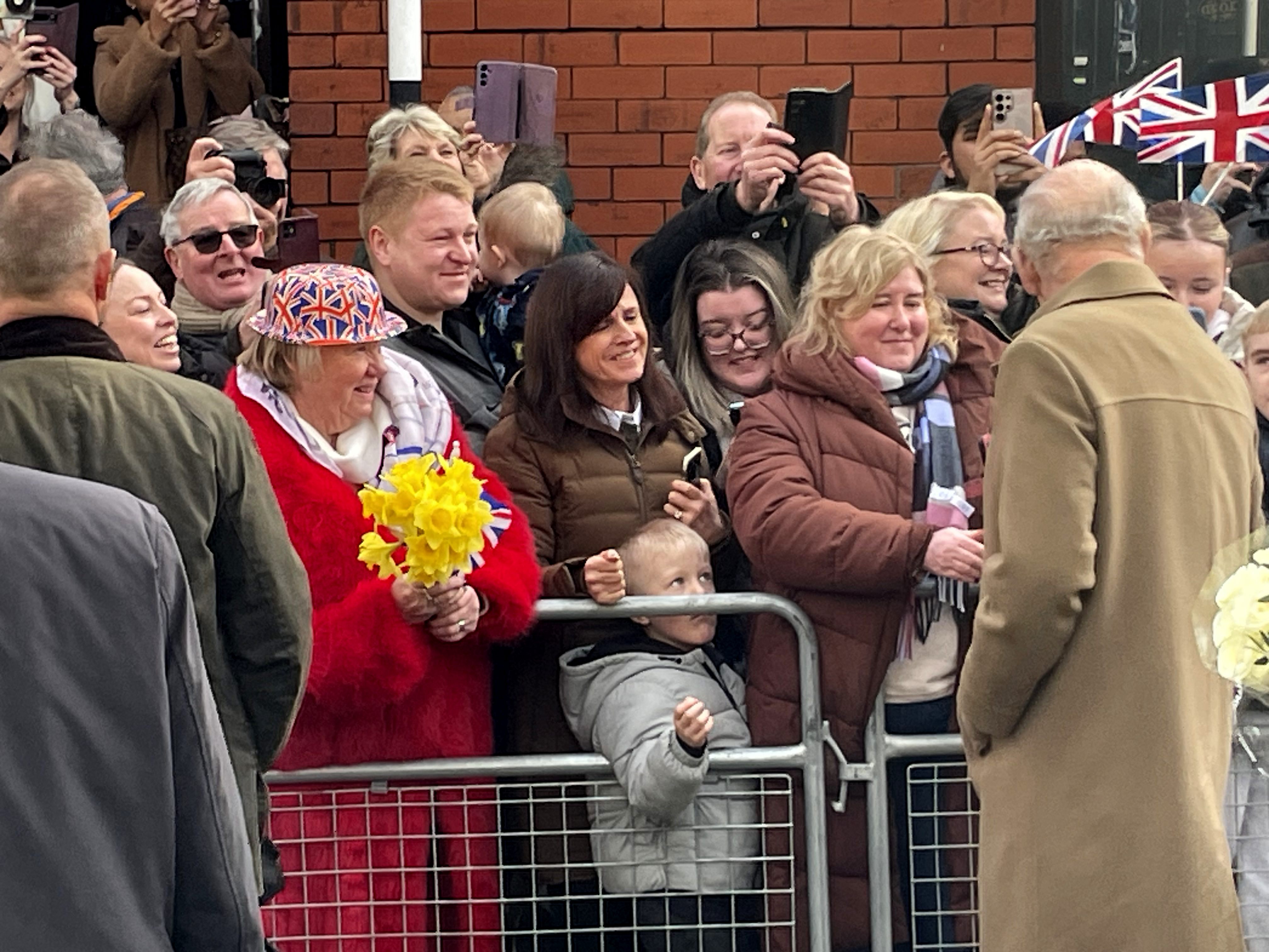 His Majesty arrived at the town’s railway station in the Royal train to be greeted by hundreds of people lining up to cheer, clap and wave Union flags.