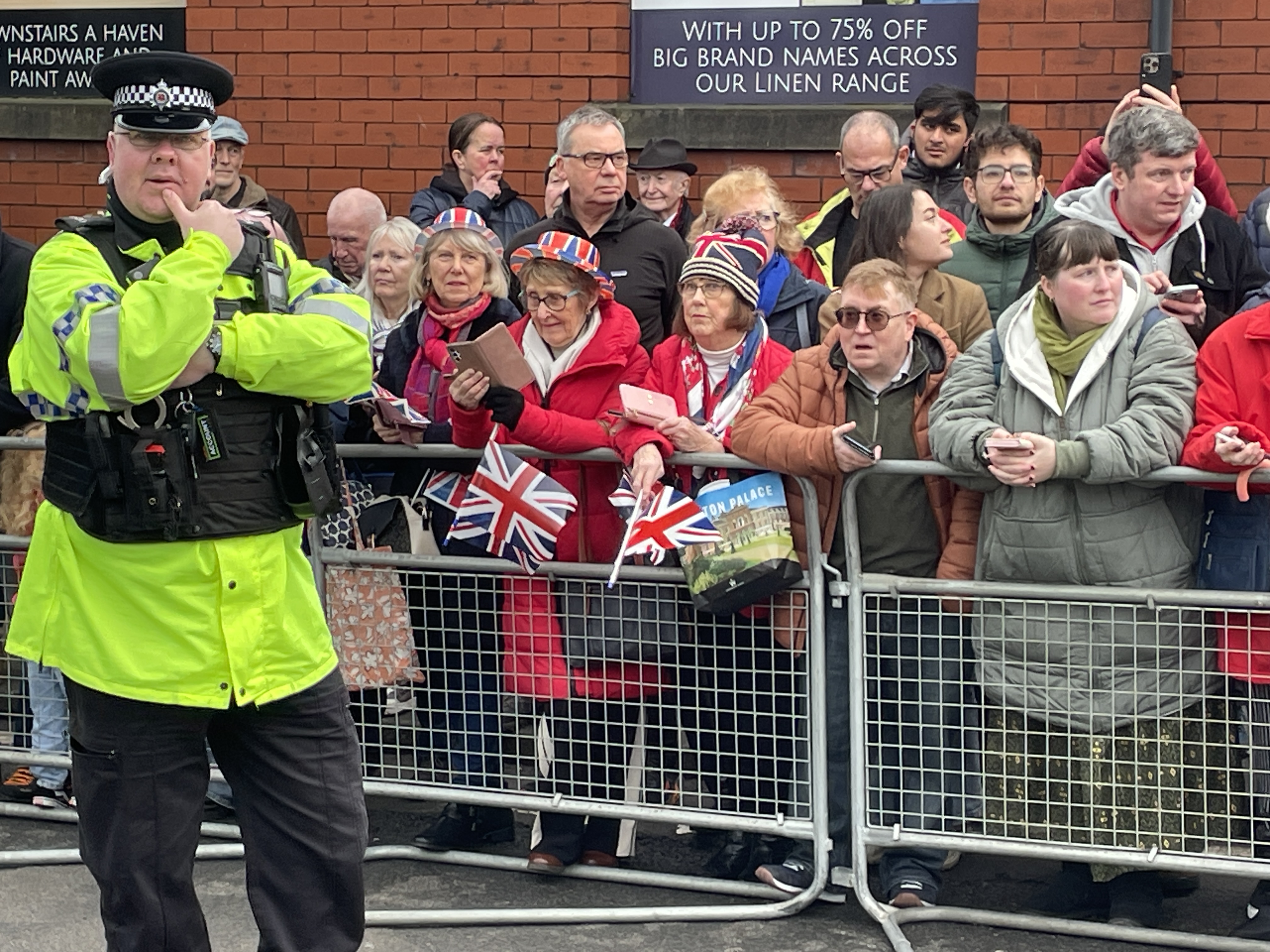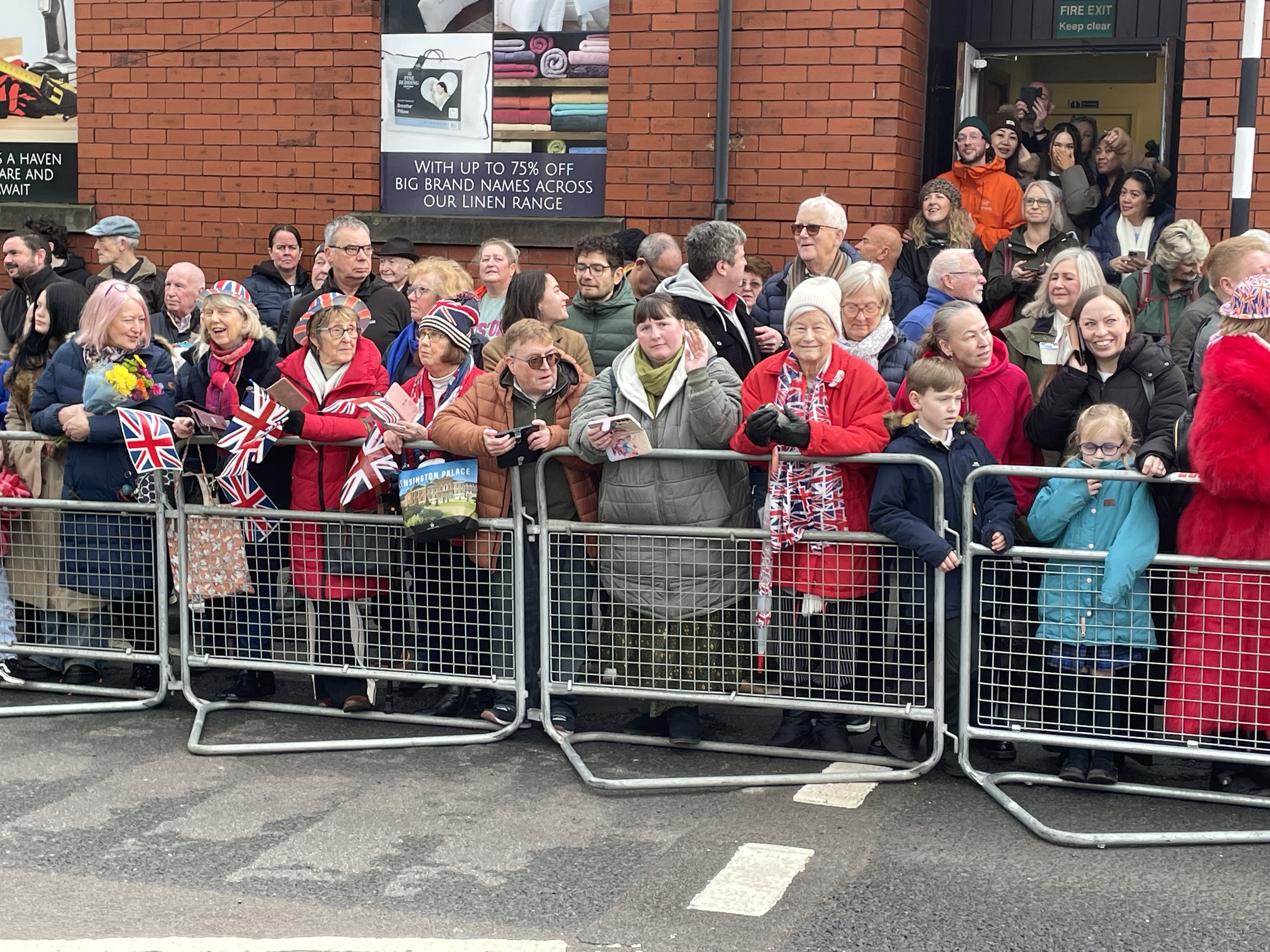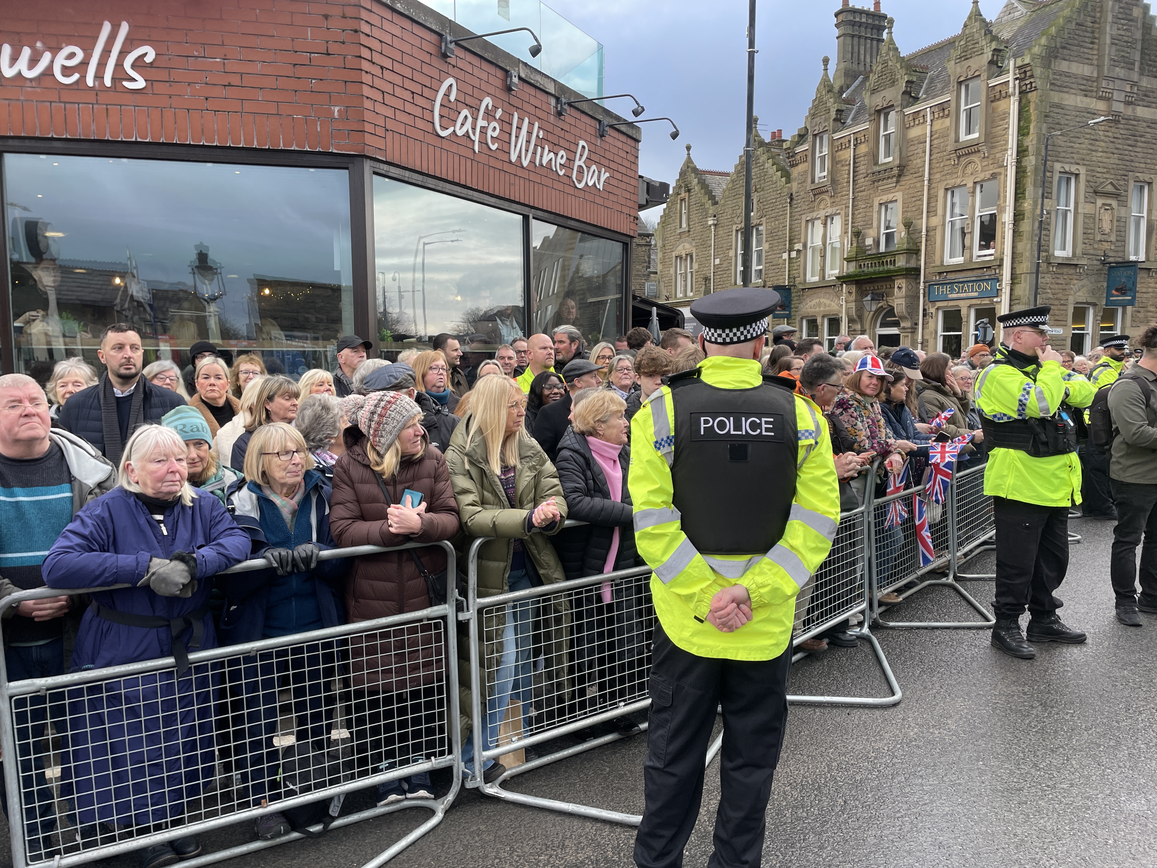 His Majesty arrived at the town’s railway station in the Royal train to be greeted by hundreds of people lining up to cheer, clap and wave Union flags.